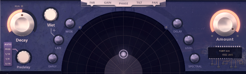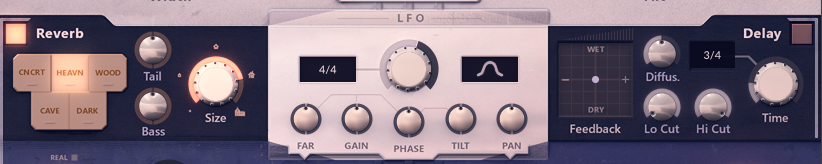 바로 하단에는 패닝 모듈이 거대하게 자리잡고 있다. 그리고 위에서 보았던 리버브 및 딜레이 모듈이 아래에도 확장되어 있다. Decay 노브 및 PreDelay 노브, 그리고 Amount 노브가 모서리에 위치해 있고, 리버브 모듈의 다른 기능들인 Early, Late, Wide와 Delay 모듈의 다른 기능인 Delay, Level, Spectral 등의 노브들이 자리잡고 있다. 그런데 위의 기능들보다는 상대적으로 눈에 띄진 않는다. 각 모듈들을 세부적으로 조절할 분들에게 적합하다.