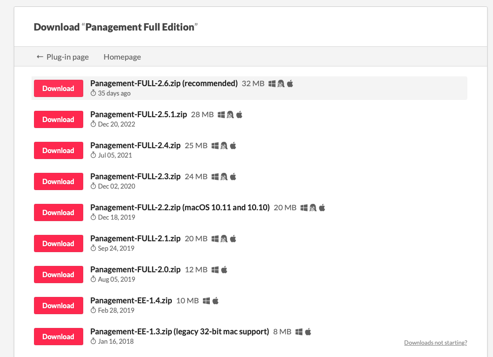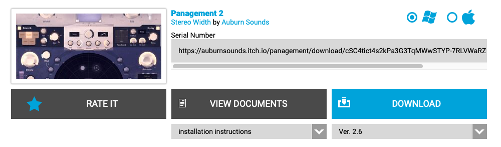 itch.io 계정 연동까지 끝났다면 이제 Auburn Sound Panagenet 2 설치 파일을 다운로드할 수 있다. 별도의 인증 과정은 없기에 다운로드 파일을 잘 관리하자. 만일 파일을 분실했더라도 itch.io에서 다시 다운로드받을 수 있다.