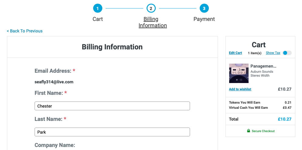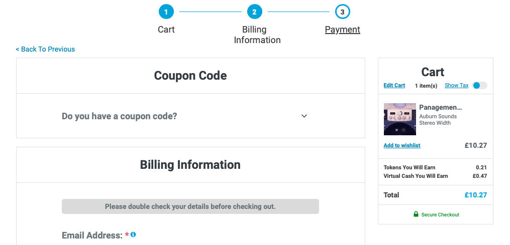 Auburn Sound Panagenet 2 구매 링크 (PluginBoutique)를 클릭하거나, Plugin Boutique(링크)에 접속한 후, 검색창에 "Auburn Sound Panagement 2"를 검색하면 위와 같은 화면이 나타난다. Plugin Boutique는 회원 가입을 하지 않아도 상품 구매가 가능하지만, 회원 가입을 하는 편이 추후 라이센스 관리에 용이하다. 기본값은 파운드화로 나타나지만 달러나 엔, 유로화로 가격을 바꿔가며 확인할 수 있다. 다만, 대한민국 원은 지원하지 않으므로 해외 결제가 지원되는 카드나 페이팔 계정을 미리 준비할 필요가 있다. Add to Cart를 클릭하여 상품을 내 장바구니로 담자.