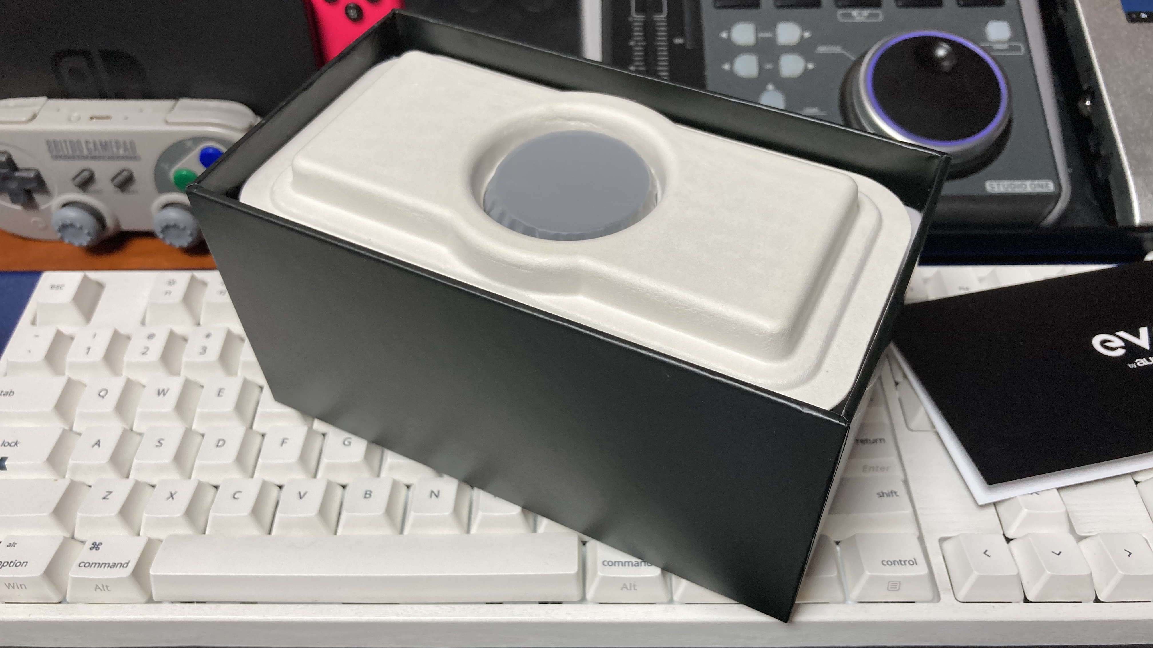 사용 설명 카드를 들어내면 비닐에 감싸진 Audient EVO 4의 볼륨 노브가 드러난다. Audient EVO 4의 디자인적 포인트 중 하나인 볼륨 노브가 골판지 완충재로 강조되고 있다. 완충재를 대충 만들어도 될 법한데 포인트를 살리며 만들었다는 점이 마음에 든다.