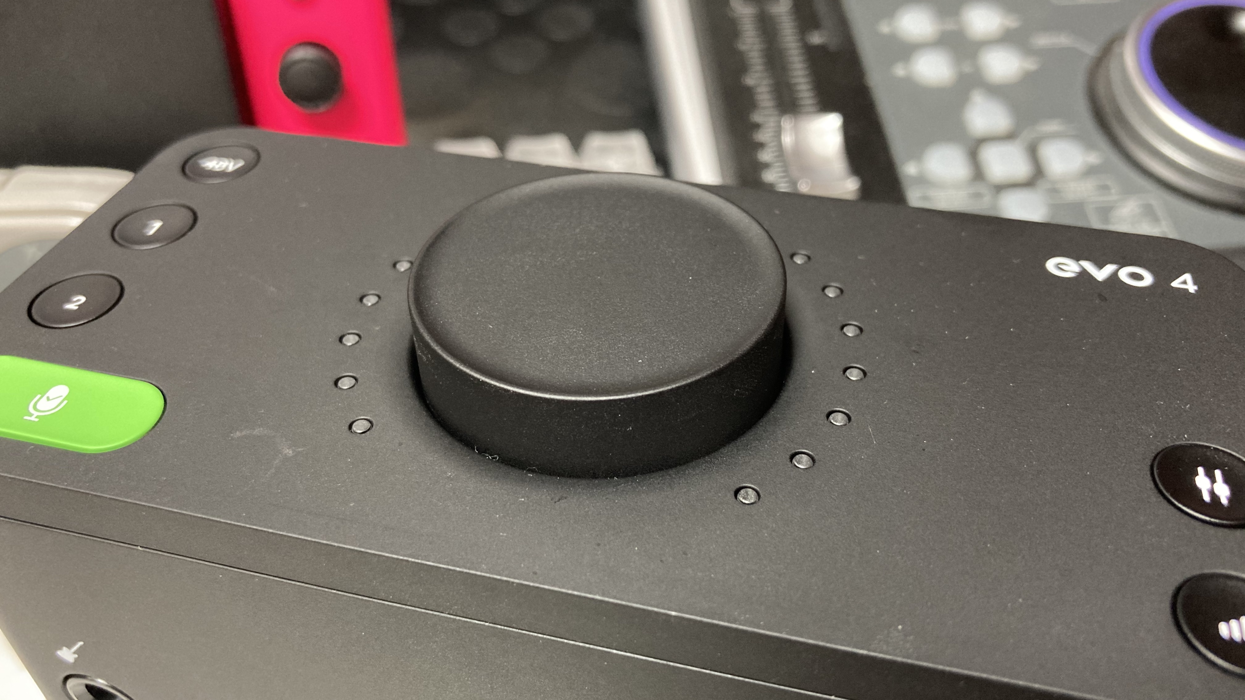 Audient EVO 4의 상단 패널은 매우 심플하게 배치되어 있다. 가운데의 큰 노브를 기준으로, 좌측에는 입력 채널에 팬텀 파워를 넣을 수 있는 [48V] 버튼, 각 프리앰프 채널의 입력 레벨을 조절할 수 있게끔 전환하는 [1] 및 [2] 버튼, EVO 4의 핵심 기능 중 하나인 SmartGain 버튼이 있고, 우측에는 모니터 및 입력 채널의 패닝의 정도를 조절할 수 있는 [모니터 믹스] 버튼과 스피커 및 헤드폰 볼륨으로 전환하는 [볼륨] 버튼이 있다.