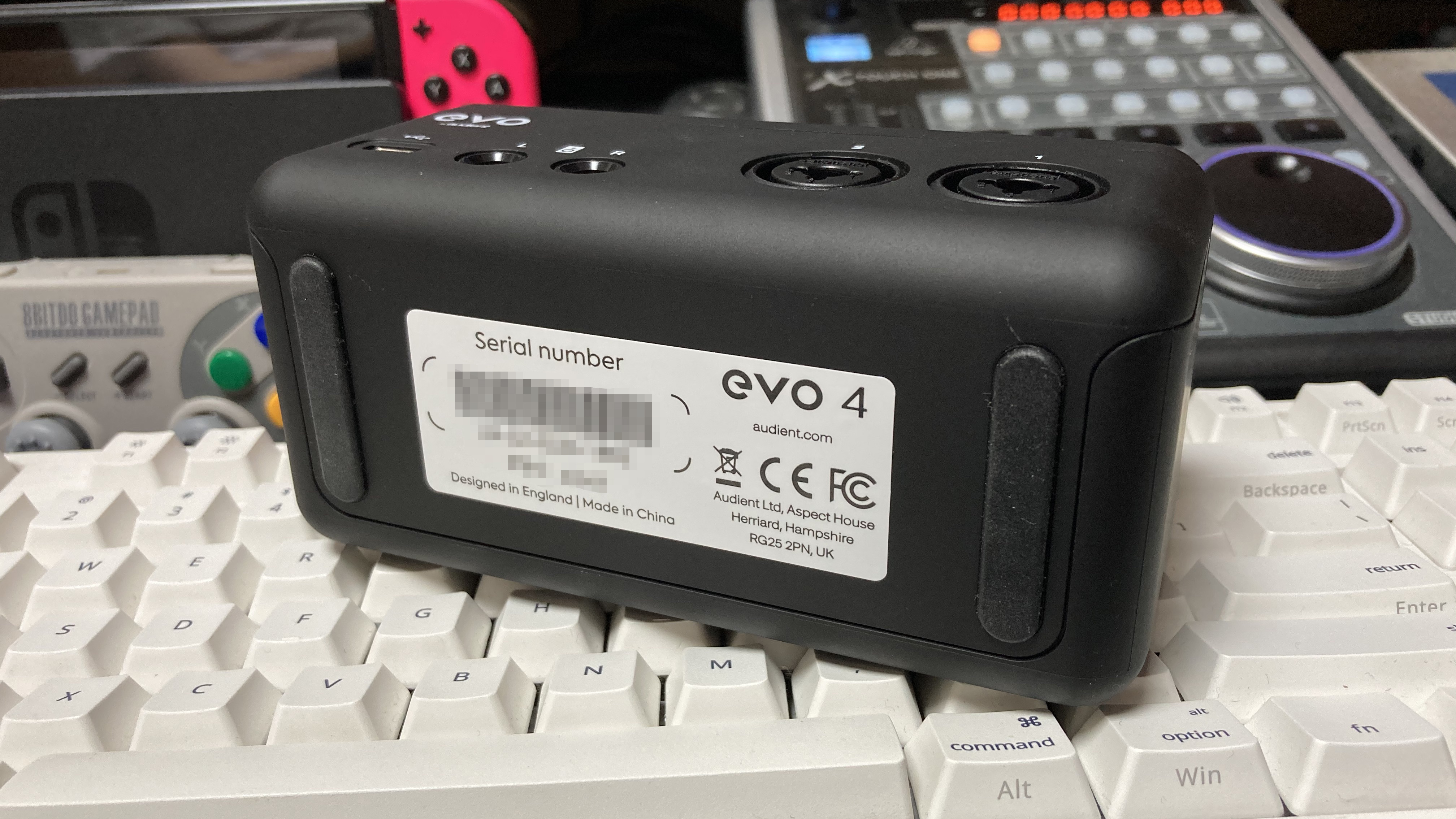 Audient EVO 4의 바닥에는 제품 등록을 위한 시리얼 번호 및 번들 소프트웨어를 다운받기 위해 필요한 PIN 번호가 있다. 시리얼 번호는 박스에도 있지만 PIN 번호는 오디오 인터페이스 바닥에만 있으므로 번들 소프트웨어를 다운로드할 사람이라면 잊지 말고 확인해놓자.