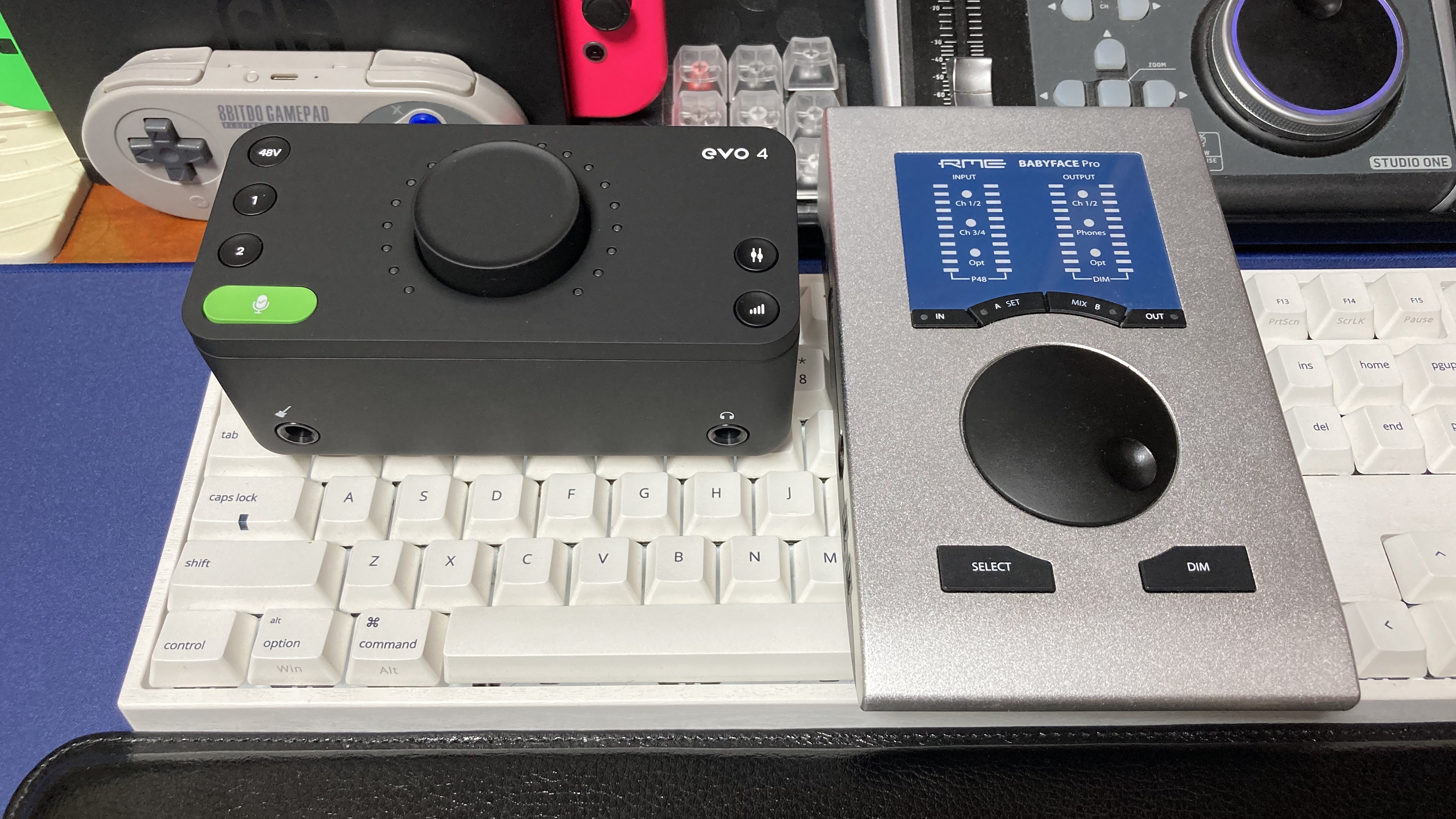 휴대성 하면 생각나는 다른 오디오 인터페이스가 있다. 현재 필자의 주력 인터페이스이자 박스가 캐링 케이스 역할을 하는 오디오 인터페이스, RME의 Babyface Pro다. 2017년에 구매했지만 3년 동안 필자의 작업실 및 외부 작업에서나 아무런 문제 없이 일관적인 성능을 보여준 기특한 녀석이다. 이미 Babyface Pro는 필자 말고도 다른 라이브 엔지니어들 사이에서도 휴대성과 성능을 동시에 잡은 오디오 인터페이스로 명성이 높다. Babyface Pro와 Audient EVO 4는 지향하는 목표가 다르기 때문에 직접적인 비교는 삼가야 하지만 둘 다 휴대성이 좋은 인터페이스에 속하기 때문에 외관만 비교를 진행하도록 하겠다.