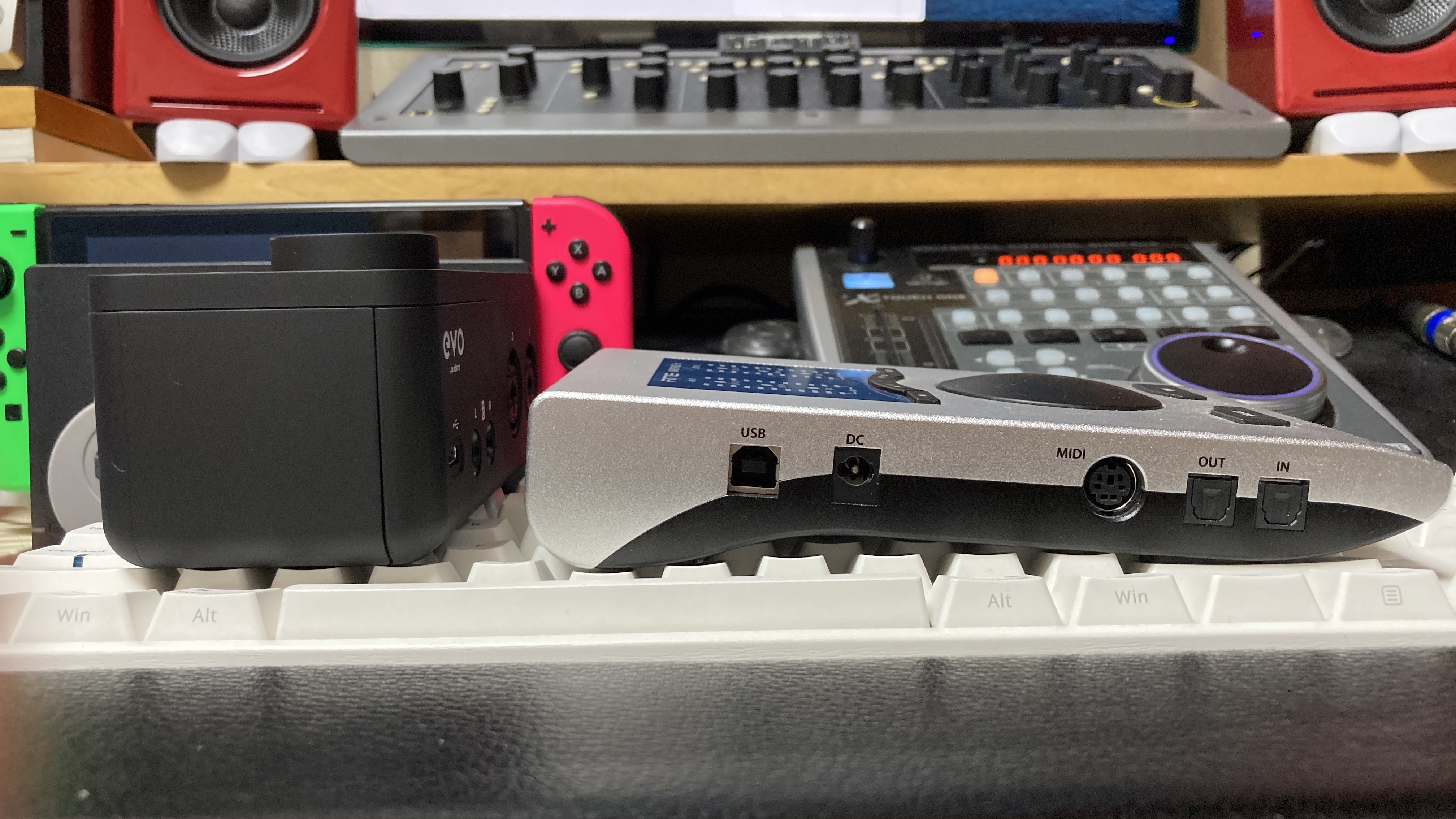 다만, 높이를 비교했을 때엔 Audient EVO 4가 Babyface Pro보다 압도적으로 높았다. 가로 및 세로 길이를 줄인 만큼 높이를 높인 것으로 생각되는데, 이 정도로 줄였음에도 높이가 그렇게 높지 않다는 점은 칭찬해줘야 한다. 다만 아쉬운 점은 Babyface Pro는 전면이 살짝 기울어진 사다리꼴 모양으로 되어 있어 볼륨 노브 및 다른 버튼들을 누르기 편리한데, Audient EVO 4는 노브 및 버튼들이 수직으로 배치되어 있기 때문에 Babyface Pro보다 조작 시 손이 조금 더 많이 움직여야 한다. 몇 cm밖에 되지 않은 차이지만 한 자리에서 오래 오디오 인터페이스를 만진다면 은근히 신경 쓰인다.