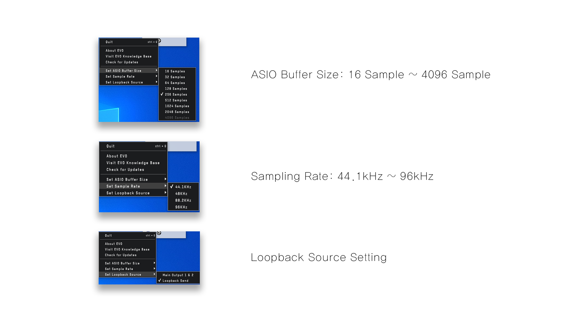EVO 전용 어플리케이션에서는 펌웨어 업데이트, ASIO 버퍼 사이즈, 샘플링 레이트 및 루프백 설정을 할 수 있다. macOS의 어플리케이션 역시 Windows의 것과 거의 동일하지만, ASIO 버퍼 사이즈, 샘플링 레이트 설정은 빠져 있다. 상단의 자료 사진에서도 확인할 수 있듯 Audient EVO 4는 최대 96kHz까지 지원하는데, Forcusrite나 Fluid Audio 등 다른 오디오 인터페이스 제조사들은 보급형 오디오 인터페이스에도 192kHz를 지원한다는 점에서 아쉬운 부분이다. 또한 필자는 EVO 전용 어플리케이션이 사실 마음에 안 들었는데, 별도의 프로그램 창이 뜨는 게 아닌 작업 표시줄에서 EVO 전용 프로그램을 우클릭해야 설정을 할 수 있기 때문이다. 추후 업데이트로 소프트웨어 믹서가 추가되어 스피커 볼륨이나 프리앰프 레벨 등을 컴퓨터에서도 조절할 수 있으면 좋을 듯하다.
