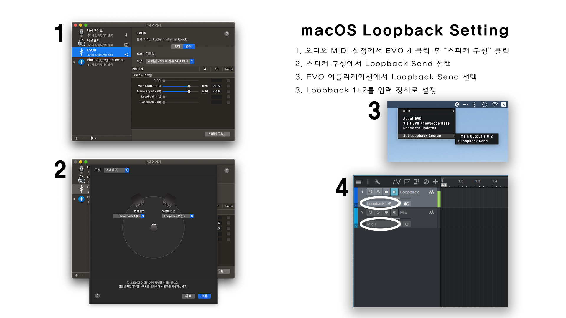 macOS에서 Audient EVO 4의 루프백 모드를 세팅하기 위해서는 "EVO" 어플리케이션이 컴퓨터에 설치되어 있어야 한다. 루프백을 세팅하는 방법은 다음과 같다.