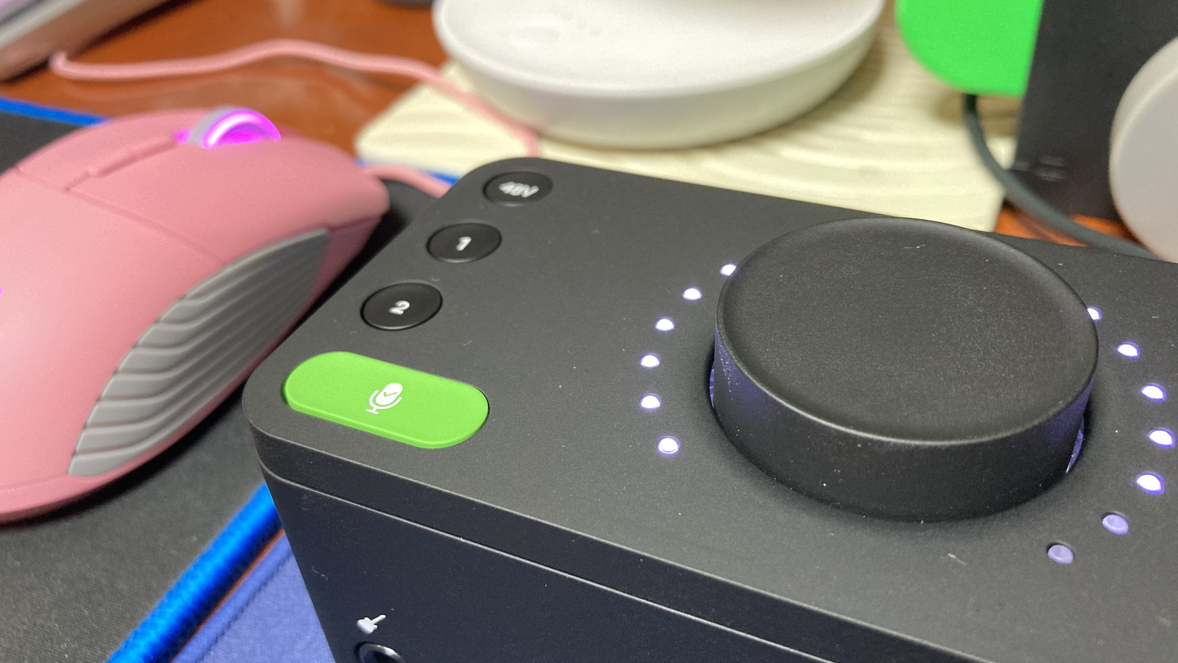 한가운데에 자리 잡고 있는 노브는 모드에 따라 다양하게 사용하게끔 설계되어 있다. 프리앰프 모드에서는 노브를 돌려 프리앰프 게인을 설정할 수 있고, 모니터 모드에선 악기와 컴퓨터 소리의 비율을 조절할 수 있다. 스테레오 패닝 모드에선 입력 채널을 패닝 하는 데 사용한다. 물론 볼륨 조절 모드에선 헤드폰 및 스피커의 볼륨 조절이 가능하다. Babyface Pro를 써 왔던 필자로서는 매우 익숙한 구성이다. 볼륨 노브는 부드럽게 돌아가는데, Babyface Pro처럼 돌릴 때마다 촉각적으로 걸리는 느낌이 있다. 또한 돌리는 속도에 따라 레벨이 변화하는 속도가 다른데. 천천히 볼륨 노브를 돌리면 정직하게 단계별로 레벨이 증가하지만, 빠르게 돌리면 가속을 받아 빠르게 레벨이 증가한다.
