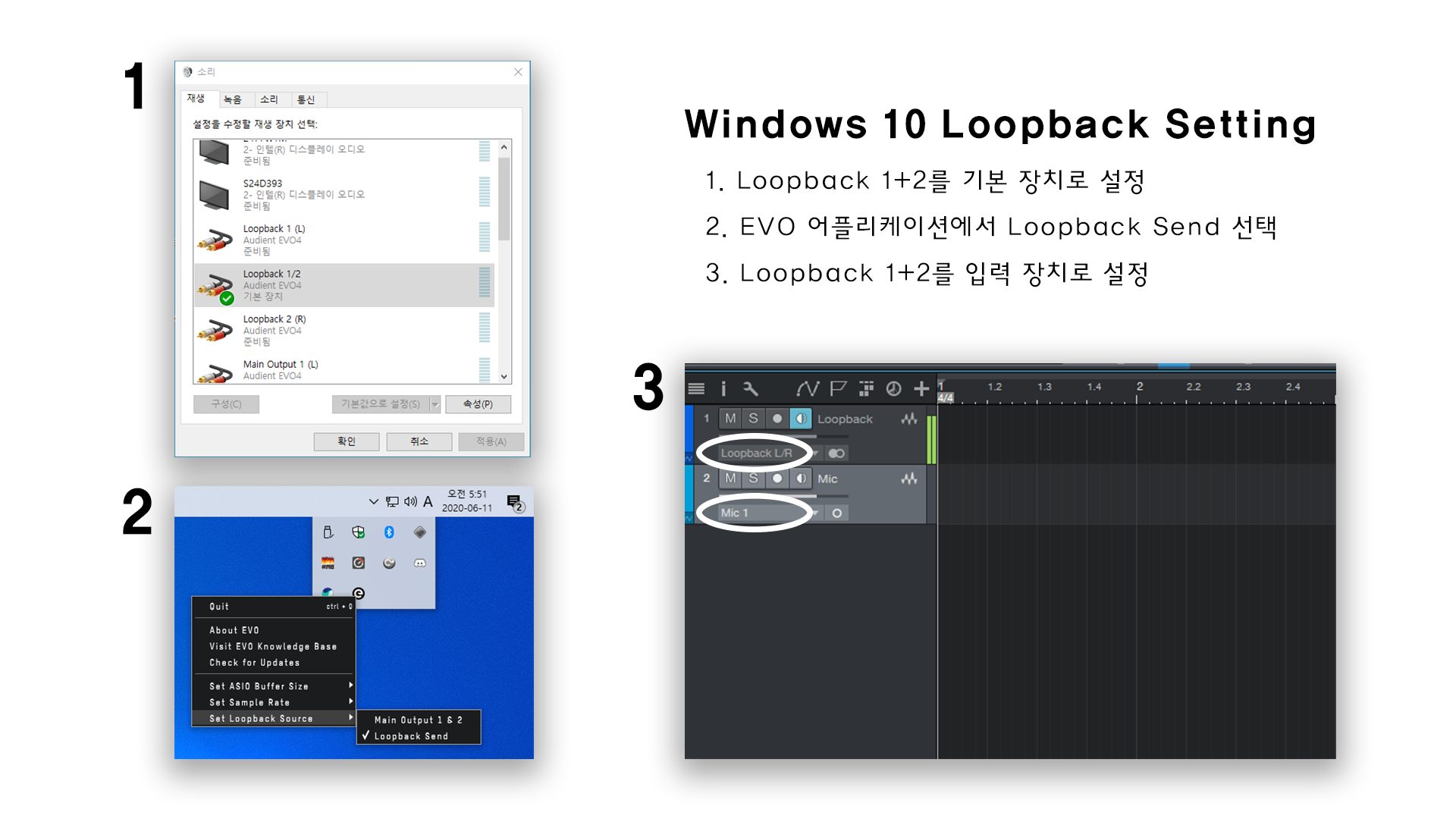 Windows 10에서 Audient EVO 4의 루프백 모드를 세팅하기 위해서는 macOS와 마찬가지로 "EVO" 어플리케이션이 컴퓨터에 설치되어 있어야 한다. 과정은 비슷하지만 차이가 있다. 루프백을 세팅하는 방법은 다음과 같다.