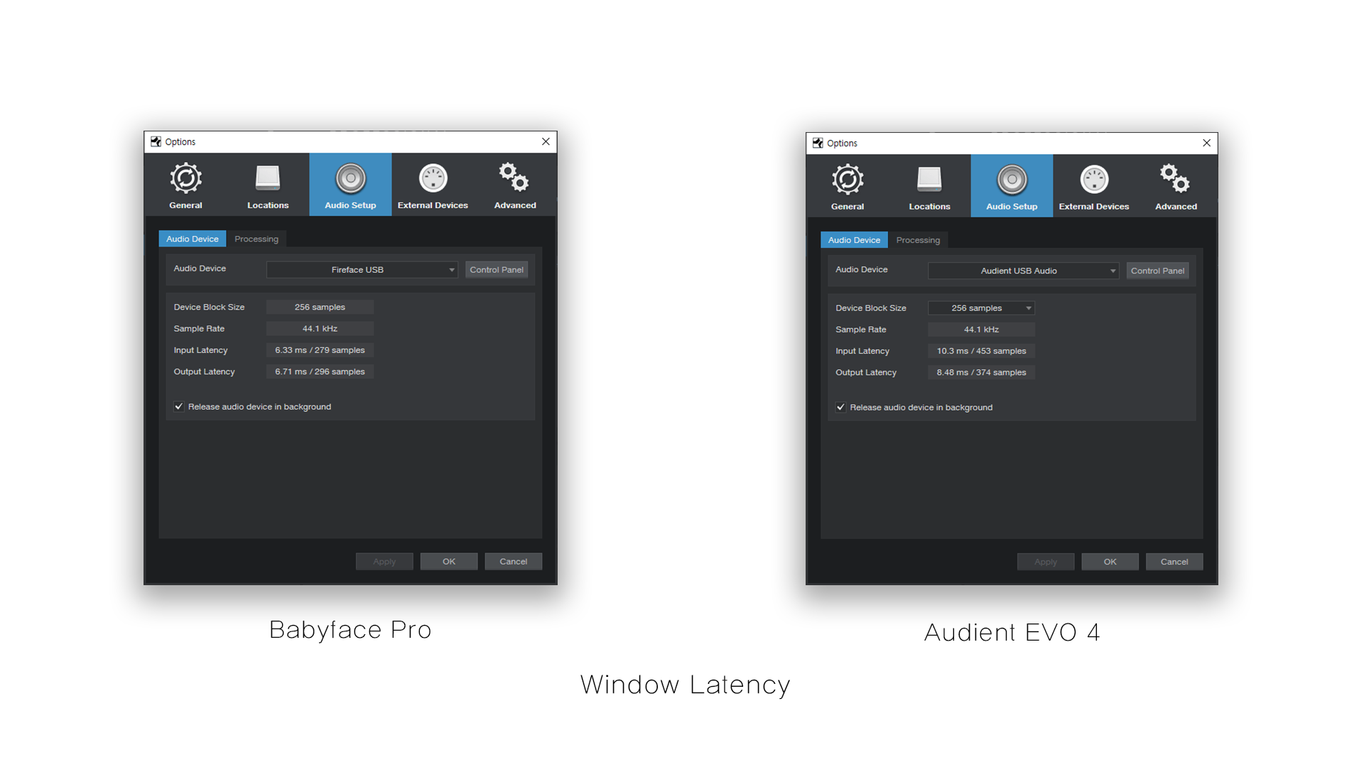 전체적인 크기에서는 Audient EVO 4의 압승이다. 사진에서도 확인할 수 있듯, Audient EVO 4를 2개를 붙여야 Babyface Pro와 길이가 얼추 같아진다. 사이즈가 작기 때문에 백팩이 아닌 메신저백이나 노트북 가방 등 작은 가방에도 간편하게 오디오 인터페이스를 들고 다니며 레코딩 등의 작업이 가능해진다. 외부에서 작업하는 아티스트들에게 있어서 새로운 선택지가 주어진 셈이다.