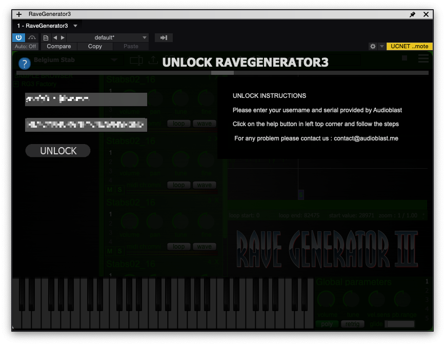 새롭게 받은 코드를 Rave Generator 3을 실행한 후, 이메일과 같이 입력한 후 Unlock 버튼을 누르면 인증이 마무리된다. 이제 즐겁게 Rave Generator 3을 쓰면 된다.