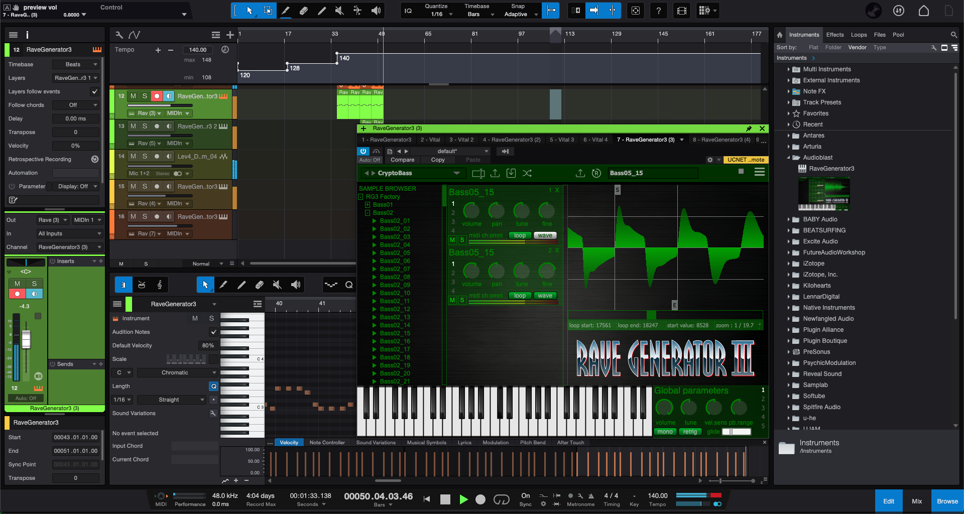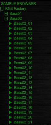 가장 먼저, 좌측에 보이는 긴 창은 샘플 브라우저다. 외장 샘플이나 Rave Generator 3 내부의 샘플들을 한 눈에 볼 수 있다. 샘플 좌측에 있는 재생 버튼을 눌러 미리 프리뷰를 들어볼 수도 있다.