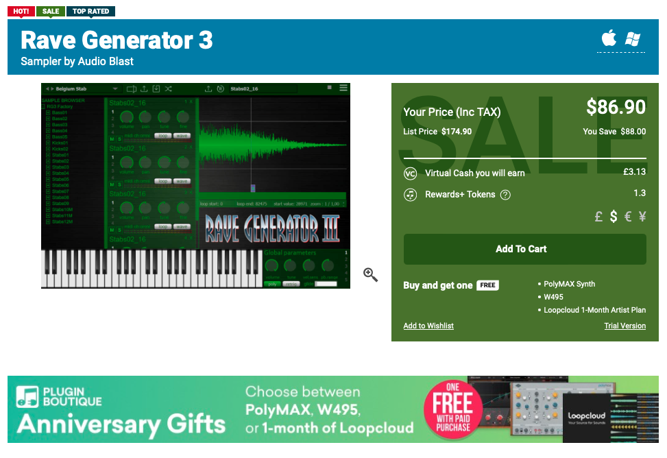 Audio Blast Rave Generator 3는 현재 국내에서는 판매처가 없다. 그렇기에 어쩔 수 없이 해외 구매를 쓸 수밖에 없다. 해외 구매를 이용한다면 Audio Blast 공식 홈페이지나 플러그인 전문 샵을 이용할 수 밖에 없다. 가장 확실한 건 공식 홈페이지를 이용하는 방법이다. 그러나 필자는 공식 홈페이지 말고 플러그인 전문 샵을 주로 이용하고 있다. 특히 대부분 Plugin Boutique를 이용한다. 요즘 들어서 Plugin Boutique에서는 아무 플러그인이나 구매하더라도 사은품으로 다른 플러그인을 주거나, 믹싱 및 마스터링 관련 E-Book을 끼워주는 이벤트를 자주 하고 있기에 만일 Plugin Boutique를 사용하지 않았던 분이라면 이 참에 사용해 보는 것도 좋다. 그런 고로 아래의 접은 글에서는 Plugin Boutique를 통해 Audio Blast Rave Generator3를 구입하는 방법에 대해 알아보도록 하겠다.