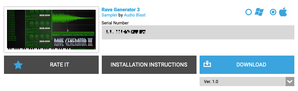 결제가 끝난 후, 상단의 "My Account"를 클릭하면 방금 전에 구매한 Audio Blast Rave Generator 3의 코드가 표시되어 있다. 여기서 설치 파일 다운로드와 설치 시 주의사항 등을 확인할 수 있다. 만일 시리얼 대신 영문으로 긴 안내문이 표시되어 있다면 아직 전산상으로 시리얼 번호가 발급되지 않았다는 뜻이므로 조금 기다려야 한다.