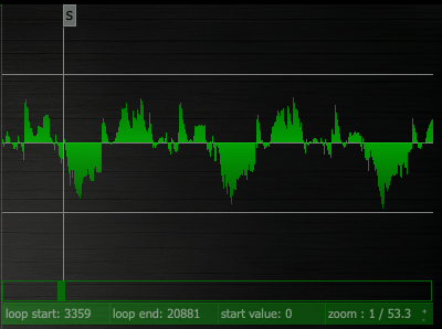 우측에는 거대한 웨이브 파형이 표시되어 있다. 이건 좌측의 편집 브라우저의 샘플과 연계되는데, 여기서 샘플의 시작점과 끝점을 정할 수 있다. 설정 방법은 굉장히 직관적이다. 그냥 시작점과 끝점에 바를 옮기면 된다.