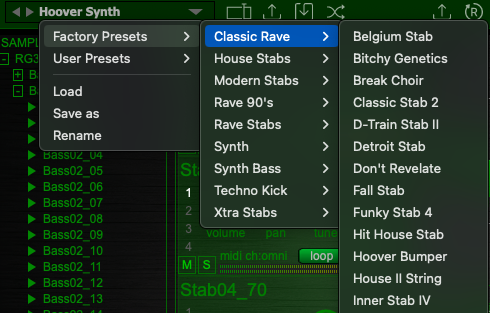 Rave Generator 3는 사용하기 편리한 샘플러다. 그런데, 내가 만든 샘플이 부족하거나, 어떤 식으로 활용해야 할지 어려울 때가 있다. 그럴 때에는 프리셋을 적극적으로 활용해 보자. 프리셋의 종류가 굉장히 많다! 옛 레이브 감성을 잘 담은 프리셋부터 킥 사운드까지 다양한 사운드를 클릭 한 번으로 내 음악에 가져올 수 있다. 만일 작업이 막힌다면 프리셋의 도움을 받아보자.