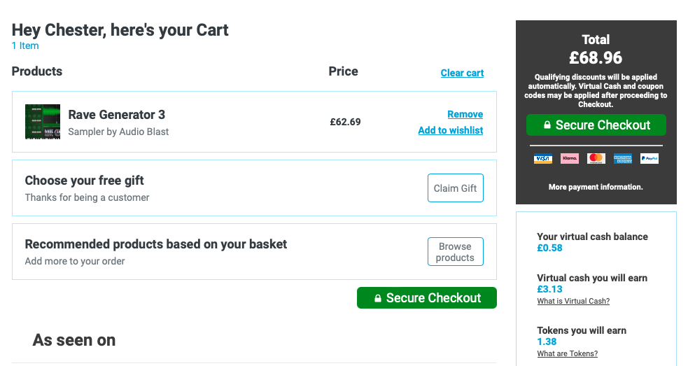 홈페이지 상단 우측에 자리 잡은 Cart를 누르면 다음과 같은 화면이 나타난다. 이 화면에서는 이번 구매로 적립되는 캐시, 구매로 적립되는 토큰을 확인할 수 있으며 상품 구매로 받을 수 있는 무료 선물을 선택할 수 있다. 만일 Plugin Boutique에서 처음 구매한다면 Claim Gift를 클릭해서 무료 선물을 받아가는 게 좋다. 플러그인 하나만 샀을 뿐인데 공짜로 다른 플러그인들도 가져갈 수 있다. 무료로 받을 수 있는 플러그인들은 기간에 따라 다르니 미리 구매 전에 어떤 걸 무료로 주는지 체크해 보는 것도 좋다. 모든 작업이 완료되었다면 초록색 "Secure Checkout"을 눌러 다음 화면으로 넘어가자.