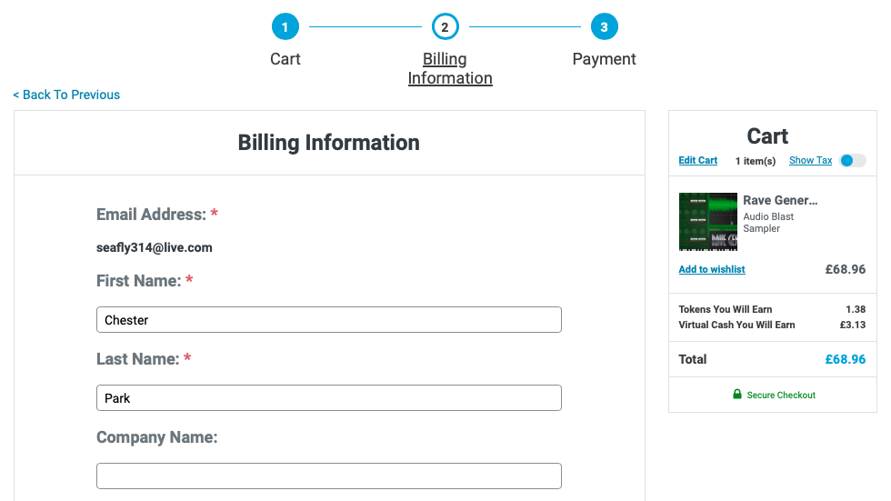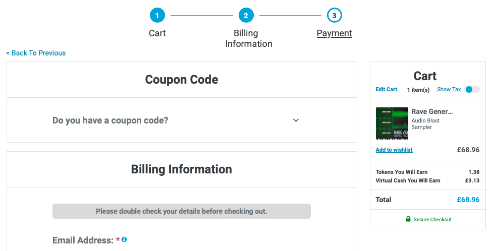 Audio Blast Rave Generator 3 구매 링크 (PluginBoutique)를 클릭하거나, Plugin Boutique(링크)에 접속한 후, 검색창에 "Audio Blast Rave Generator 3"를 검색하면 위와 같은 화면이 나타난다. Plugin Boutique는 회원 가입을 하지 않아도 상품 구매가 가능하지만, 회원 가입을 하는 편이 추후 라이센스 관리에 용이하다. 기본값은 파운드화로 나타나지만 달러나 엔, 유로화로 가격을 바꿔가며 확인할 수 있다. 다만, 대한민국 원은 지원하지 않으므로 해외 결제가 지원되는 카드나 페이팔 계정을 미리 준비할 필요가 있다. Add to Cart를 클릭하여 상품을 내 장바구니로 담자.
