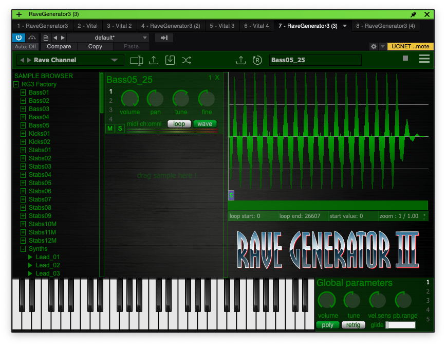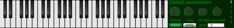 하단에는 건반과 글로벌 파라미터, 그리고 이펙터 설정들이 모여 있다. 건반에서 곧바로 어떤 소리가 나는지 체크할 수 있어 편리하다. 우측에는 글로벌 파라미터라 해서 각 샘플들의 파라미터가 아닌 전체적인 소리의 파라미터를 정할 수 있다.