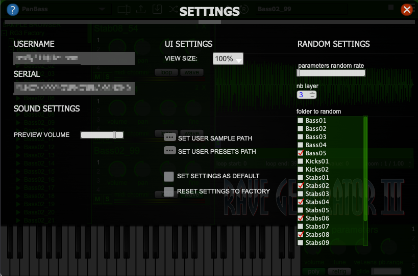 우측에 있는 햄버거 메뉴를 누르게 된다면 진짜 설정 모드로 들어오게 된다. 샘플 브라우저에서 미리 샘플을 확인할 떄의 볼륨값이나 파라미터들의 랜덤값 정도, 레이어 개수, UI 크기 등 다양한 기능들이 들어가 있다. 현재 Rave Generator 3에 등록된 유저 이름 및 시리얼 번호도 확인할 수 있다.