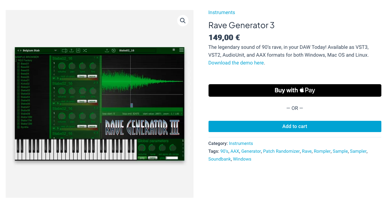 Audio Blast라는 회사는 그렇게 이름이 알려진 회사는 아니다. 마치 이 회사의 포트폴리오를 보면 생각보다 다양한 플러그인들을 개발했던 전적이 있다. 물론 대부분이 많이 알려지진 않았다. 그러나, 이 회사의 불세출적인 히트작이 하나 있는데, 바로 Audio Blast 사의 Rave Generator 3다. Audio Blast 사의 Rave Generator는 이름에서 보듯 Rave 장르를 만드는 데 특화된 가상악기다. 사실 레이브를 만드는 방법이 정해져 있는 건 아니지만 Rave Generator를 사용하면 25키 건반만으로도 레이브를 아주 쉽게 만들 수 있다. 가장 최신 버전은 3인데, 2까지만 하더라도 꽤 옛날에 개발된 가상악기라 사용하는 사람들만 사용하는 악기였다. 그런데 갑자기 3? 평소에 주변 사람들에게 Rave Generator에 대한 이야기를 익히 들었던지라 이 참에 한번 활용하고 싶어졌다. 그런데 생각보다 가격이 사악하다. 149유로? 처음 보는 사람이라면 이 가격을 보고 엣? 정말?이라는 반응이었을 거다. 필자도 정신없이 좋아했다가 가격을 보고 정신이 들었을 정도다. 다행히도 데모를 제공해주고 있어 Rave Generator 3에 흥미가 있는 분들은 찍먹을 해볼 수 있다. 또한 PluginBoutique에서 할인을 진행하고 있어 79달러라는 저렴한 가격에 구매할 수 있다.