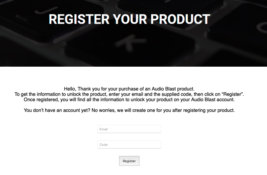 사실 PluginBoutique로부터 발급받은 코드는 Audio Blast 홈페이지에 입력해야 하는 다른 코드다. 받았다면 이제 계정으로 쓸 이메일과 코드를 입력하자. 그럼 진짜 코드가 나온다.