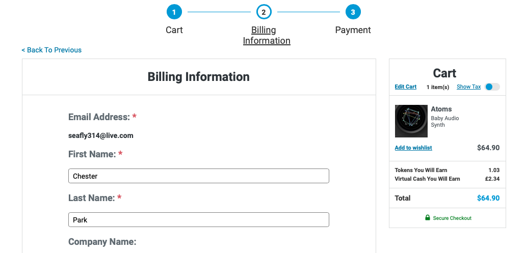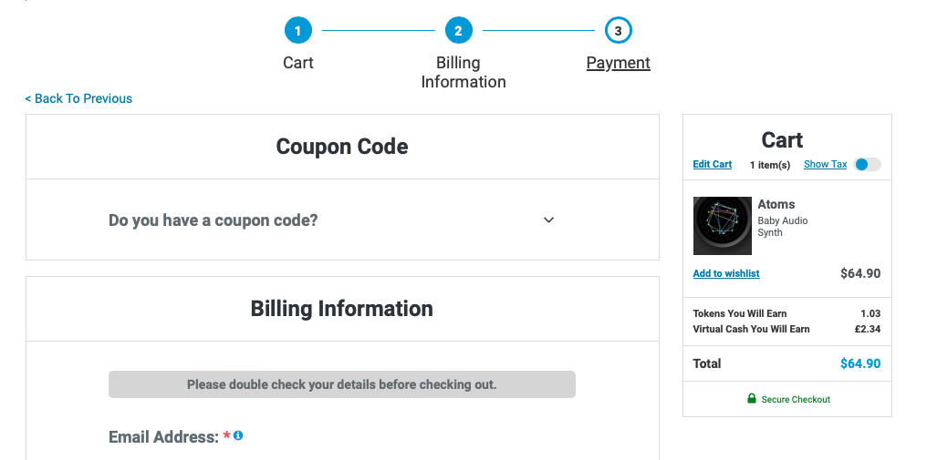 Baby Audio Atom 구매 링크 (PluginBoutique)를 클릭하거나, Plugin Boutique(링크)에 접속한 후, 검색창에 "Baby Audio Atoms"를 검색하면 위와 같은 화면이 나타난다. Plugin Boutique는 회원 가입을 하지 않아도 상품 구매가 가능하지만, 회원 가입을 하는 편이 추후 라이센스 관리에 용이하다. 기본값은 파운드화로 나타나지만 달러나 엔, 유로화로 가격을 바꿔가며 확인할 수 있다. 다만, 대한민국 원은 지원하지 않으므로 해외 결제가 지원되는 카드나 페이팔 계정을 미리 준비할 필요가 있다. Add to Cart를 클릭하여 상품을 내 장바구니로 담자.