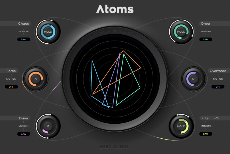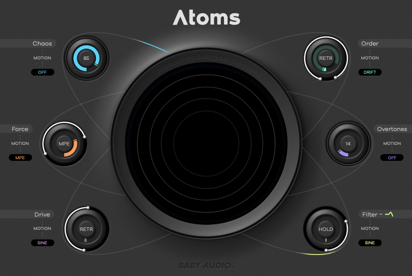 이번 글에서 소개할 Baby Audio의 최신작, Atoms는 지금까지의 Baby Audio의 이펙터들과는 약간 다르다. 서두에서 이야기한 것처럼, 피지컬 모델링 신디사이저 라는 이름을 가지고 있기 때문이다. 사실 Baby Audio는 이펙터뿐만 아니라 가상 악기도 만드는 회사다. Atoms는 Baby Audio가 만든 두 번째 소프트웨어 신디사이저다. 특이하게 스프링을 활로 켜는 것을 알고리즘으로 구현한 피지컬 모델링 방식을 활용했다고 하며, 원자들이 충돌할 때 날 법한 소리를 신디사이저로 구현할 수 있다고 한다. 컨셉도 컨셉인데, 하드웨어에서 사용될 법한 피지컬 모델링을 신디사이저에 적용했다는 점에서 굉장히 흥미로웠다. 다행히도 평소 이런 덕후 기질을 잘 알고 있던 PluginBoutique의 도움을 받아 막 나온 Atoms을 사용해 볼 수 있게 되었다. 이전과 마찬가지로 Baby Audio Atoms은 정가 99달러지만 출시 기념으로 59달러에 판매 중이다. 보통 플러그인이 출시되었을 때가 가장 저렴한 경우가 많기에 만일 여유가 있고 흥미가 생긴다면 바로 구매하는 걸 권장한다.