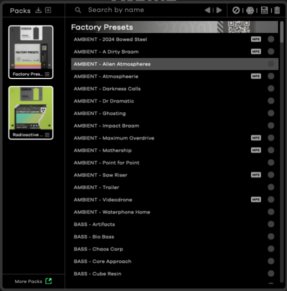Atoms는 매우 직관적이고 사용하기 편리한 신디사이저다. 직접 소리를 만들어 보는 재미도 있지만 때로는 다른 사람들이 미리 준비해 놓은 레시피를 사용해야 할 때도 필요하다. Baby Audio가 늘 그랬듯, Atoms 역시 프리셋이 굉장히 다양하게 준비되어 있다. MPE를 지원하는 프리셋의 경우, 우측에 MPE라고 표시되어 있는 점이 인상적이다. 이번엔 조금 특이한 점이 보이는데, 좌측에 Preset Pack이라는 것이 새롭게 추가되었다. 글을 쓰는 현재(2024.02)에는 기본적으로 제공되는 팩 2개가 전부지만, 추후 다른 아티스트들과 협업을 통해 개발된 새로운 프리셋 팩을 구매 혹은 추가할 수 있도록 확장할 여지를 만들어 놓았다. 아니면 늘 그렇듯, 직접 만든 프리셋이나 주변 친구나 지인들이 만들어놓은 프리셋을 불러와 사용할 수도 있다.