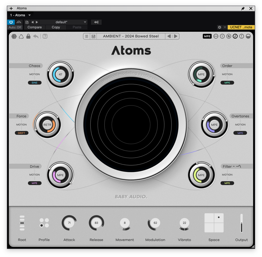 하단 기능들은 Atoms의 신디사이징 부분과 더욱 직접적으로 연결되어 있다. 가장 좌측부터 살펴보자면, Root가 눈에 먼저 들어온다. Atoms의 근음을 설정하는 기능으로 +24부터 -24까지 설정할 수 있다. 다만 옥타브 단위로 움직이기에 12, 24 이렇게 끊어진다. 그 옆에 있는 Profile은 Atoms의 음색을 설정할 수 있다. Standard, Inharmonic, Alternative, Lo-Fi 총 4개의 프로필 중 하나를 선택할 수 있는데, 미묘하게 소리가 바뀐다. 상황에 맞게 선택하면 될 듯하다. Attack과 Release는 어느 신디사이저에서나 볼 수 있는 옵션 중 하나다. 다만 Atmos가 피지컬 모델링을 사용한 신디사이저기에, 내부의 스프링 알고리즘과 연계하여 작동한다. Movement는 스프링에 활을 켜게 되었을 때의 세기와 속도를 조절하는 기능이다. 왼쪽은 세기, 오른쪽은 속도를 조절한다. BPM과 연동하여 1/2, 1/4 등으로 설정할 수도 있다. Modulation은 스프링 알고리즘과 연계되어 있는 픽업과 관련되어 있다. 이를 통해 코러스 이펙트와 비슷한 느낌을 줄 수 있다. Movement와 마찬가지로 위치 및 속도를 조절할 수 있다. Vibrato는 스프링의 강성 정도를 조절할 수 있다. 왼쪽은 세기, 오른쪽은 속도를 조절하며 BPM과 연동하여 1/2, 1/4 등으로 설정할 수도 있다. 마지막으로 Space가 있는데 특이하게 XY패드로 되어 있다. 가로축은 믹스 정도, 세로축으로는 크기를 조절할 수 있다. 설명으로는 어려울 수 있는데, 직접 써 보는 편이 가장 이해하기 쉽다.