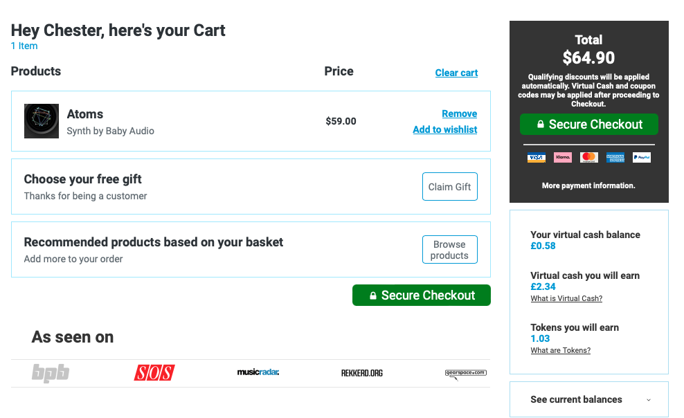 홈페이지 상단 우측에 자리 잡은 Cart를 누르면 다음과 같은 화면이 나타난다. 이 화면에서는 이번 구매로 적립되는 캐시, 구매로 적립되는 토큰을 확인할 수 있으며 상품 구매로 받을 수 있는 무료 선물을 선택할 수 있다. 만일 Plugin Boutique에서 처음 구매한다면 Claim Gift를 클릭해서 무료 선물을 받아가는 게 좋다. 플러그인 하나만 샀을 뿐인데 공짜로 다른 플러그인들도 가져갈 수 있다. 무료로 받을 수 있는 플러그인들은 기간에 따라 다르니 미리 구매 전에 어떤 걸 무료로 주는지 체크해 보는 것도 좋다. 모든 작업이 완료되었다면 초록색 "Secure Checkout"을 눌러 다음 화면으로 넘어가자.