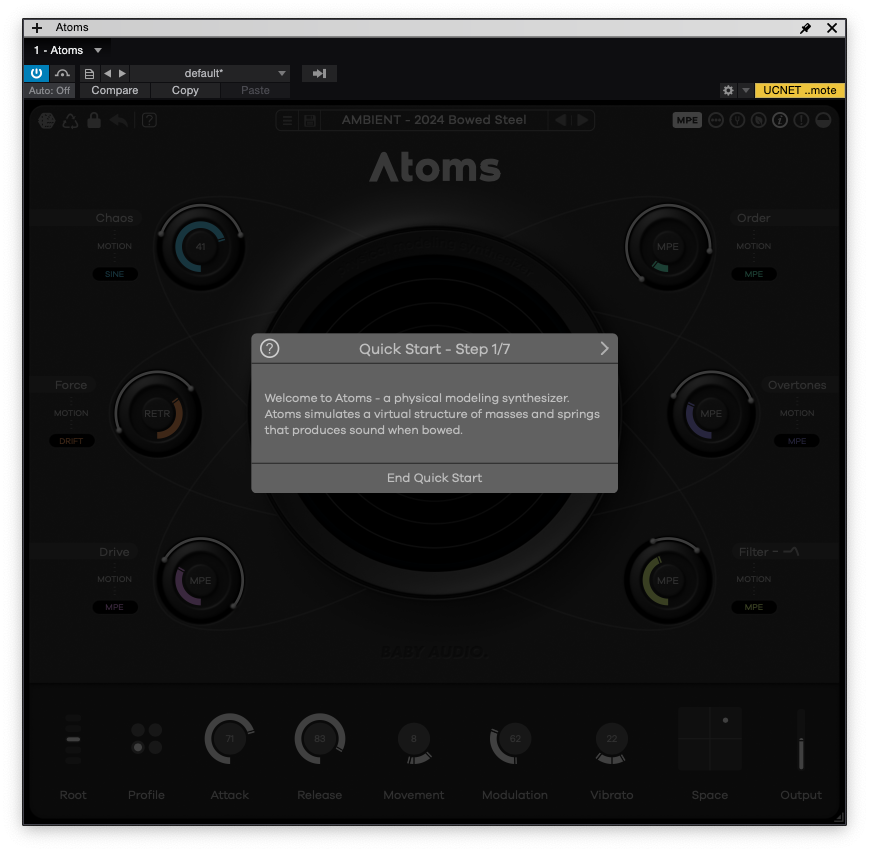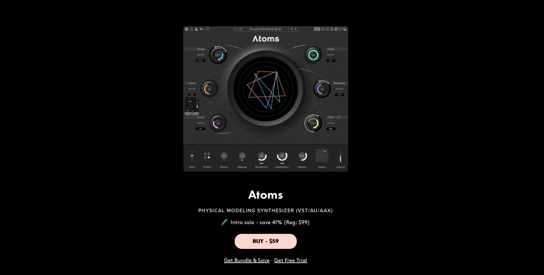 이번 글에서 소개할 Baby Audio의 최신작, Atoms는 지금까지의 Baby Audio의 이펙터들과는 약간 다르다. 서두에서 이야기한 것처럼, 피지컬 모델링 신디사이저 라는 이름을 가지고 있기 때문이다. 사실 Baby Audio는 이펙터뿐만 아니라 가상 악기도 만드는 회사다. Atoms는 Baby Audio가 만든 두 번째 소프트웨어 신디사이저다. 특이하게 스프링을 활로 켜는 것을 알고리즘으로 구현한 피지컬 모델링 방식을 활용했다고 하며, 원자들이 충돌할 때 날 법한 소리를 신디사이저로 구현할 수 있다고 한다. 컨셉도 컨셉인데, 하드웨어에서 사용될 법한 피지컬 모델링을 신디사이저에 적용했다는 점에서 굉장히 흥미로웠다. 다행히도 평소 이런 덕후 기질을 잘 알고 있던 PluginBoutique의 도움을 받아 막 나온 Atoms을 사용해 볼 수 있게 되었다. 이전과 마찬가지로 Baby Audio Atoms은 정가 99달러지만 출시 기념으로 59달러에 판매 중이다. 보통 플러그인이 출시되었을 때가 가장 저렴한 경우가 많기에 만일 여유가 있고 흥미가 생긴다면 바로 구매하는 걸 권장한다.