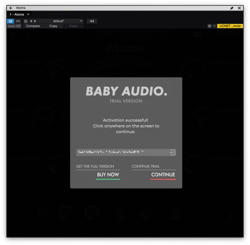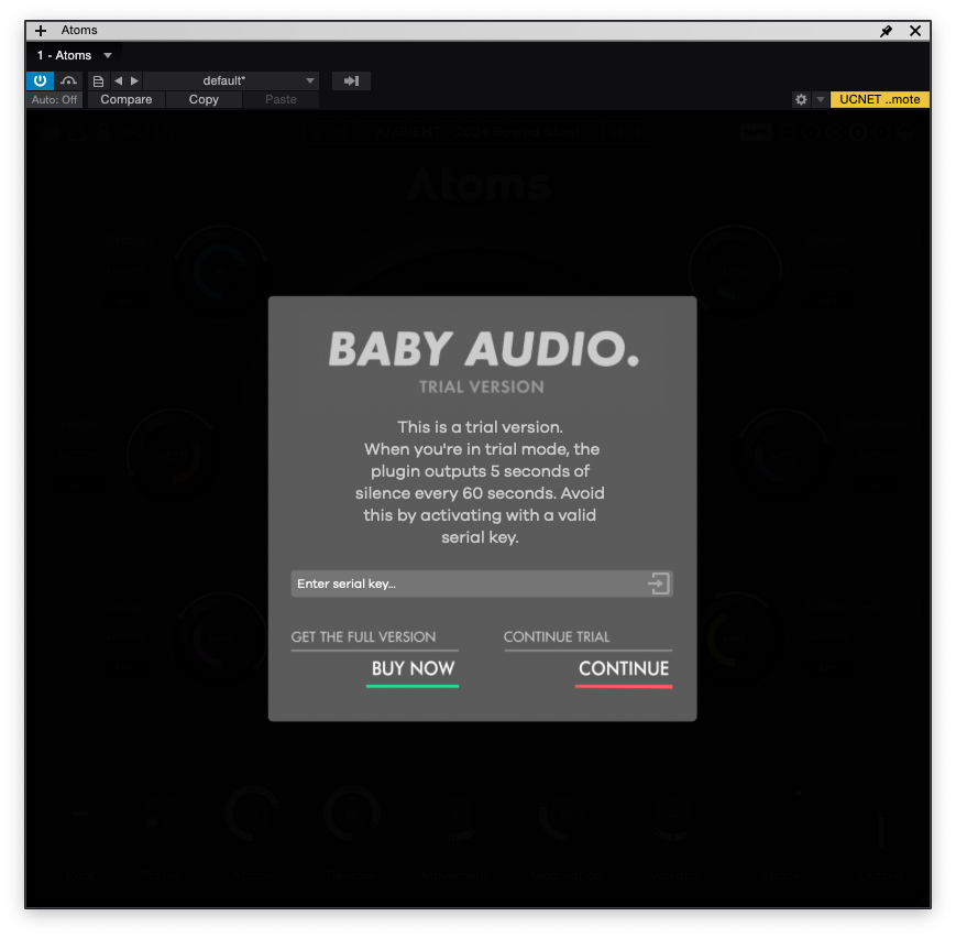 Baby Audio Atoms를 설치 후 처음 실행하게 되면 자동으로 체험판 버전으로 시작하게 된다. 여기에 라이센스 번호를 넣게 되면 플러그인 인증이 완료되는 형태다. 잠깐 플러그인을 체험할 목적이라면 하단의 컨티뉴 버튼을 눌러 체험판을 사용하면 된다. 참고로 체험판에는 60초 간격으로 5초 동안 뮤트가 걸린다.