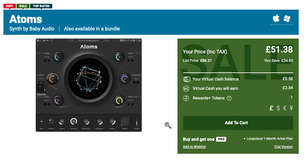 Baby Audio Atom 구매 링크 (PluginBoutique)를 클릭하거나, Plugin Boutique(링크)에 접속한 후, 검색창에 "Baby Audio Atoms"를 검색하면 위와 같은 화면이 나타난다. Plugin Boutique는 회원 가입을 하지 않아도 상품 구매가 가능하지만, 회원 가입을 하는 편이 추후 라이센스 관리에 용이하다. 기본값은 파운드화로 나타나지만 달러나 엔, 유로화로 가격을 바꿔가며 확인할 수 있다. 다만, 대한민국 원은 지원하지 않으므로 해외 결제가 지원되는 카드나 페이팔 계정을 미리 준비할 필요가 있다. Add to Cart를 클릭하여 상품을 내 장바구니로 담자.