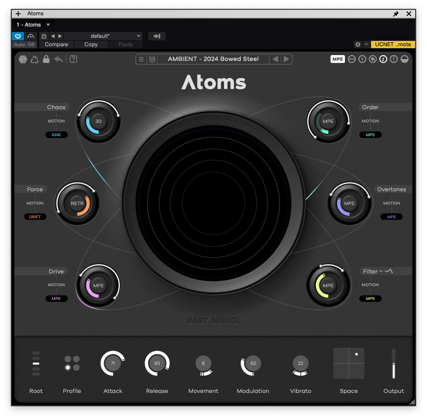 하단 기능들은 Atoms의 신디사이징 부분과 더욱 직접적으로 연결되어 있다. 가장 좌측부터 살펴보자면, Root가 눈에 먼저 들어온다. Atoms의 근음을 설정하는 기능으로 +24부터 -24까지 설정할 수 있다. 다만 옥타브 단위로 움직이기에 12, 24 이렇게 끊어진다. 그 옆에 있는 Profile은 Atoms의 음색을 설정할 수 있다. Standard, Inharmonic, Alternative, Lo-Fi 총 4개의 프로필 중 하나를 선택할 수 있는데, 미묘하게 소리가 바뀐다. 상황에 맞게 선택하면 될 듯하다. Attack과 Release는 어느 신디사이저에서나 볼 수 있는 옵션 중 하나다. 다만 Atmos가 피지컬 모델링을 사용한 신디사이저기에, 내부의 스프링 알고리즘과 연계하여 작동한다. Movement는 스프링에 활을 켜게 되었을 때의 세기와 속도를 조절하는 기능이다. 왼쪽은 세기, 오른쪽은 속도를 조절한다. BPM과 연동하여 1/2, 1/4 등으로 설정할 수도 있다. Modulation은 스프링 알고리즘과 연계되어 있는 픽업과 관련되어 있다. 이를 통해 코러스 이펙트와 비슷한 느낌을 줄 수 있다. Movement와 마찬가지로 위치 및 속도를 조절할 수 있다. Vibrato는 스프링의 강성 정도를 조절할 수 있다. 왼쪽은 세기, 오른쪽은 속도를 조절하며 BPM과 연동하여 1/2, 1/4 등으로 설정할 수도 있다. 마지막으로 Space가 있는데 특이하게 XY패드로 되어 있다. 가로축은 믹스 정도, 세로축으로는 크기를 조절할 수 있다. 설명으로는 어려울 수 있는데, 직접 써 보는 편이 가장 이해하기 쉽다.