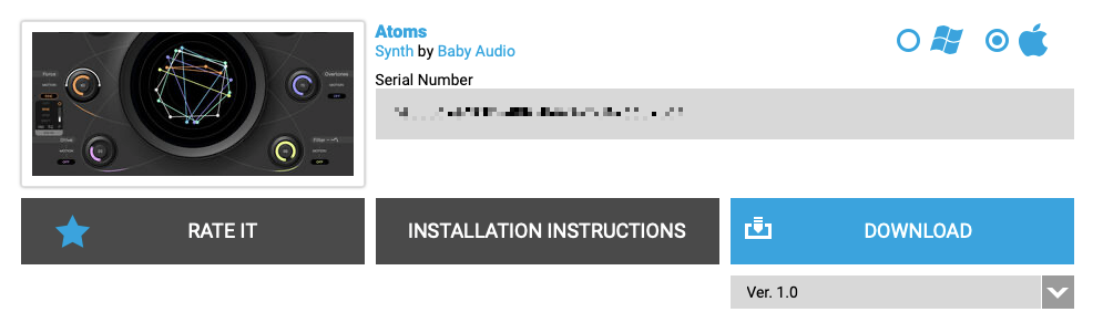 결제가 끝난 후, 상단의 "My Account"를 클릭하면 방금 전에 구매한 Baby Audio Atoms의 시리얼 번호가 표시되어 있다. 여기서 설치 파일 다운로드와 설치 시 주의사항 등을 확인할 수 있다. 만일 시리얼 대신 영문으로 긴 안내문이 표시되어 있다면 아직 전산상으로 시리얼 번호가 발급되지 않았다는 뜻이므로 조금 기다려야 한다. 이후에는 Installation Instruction을 따르자.