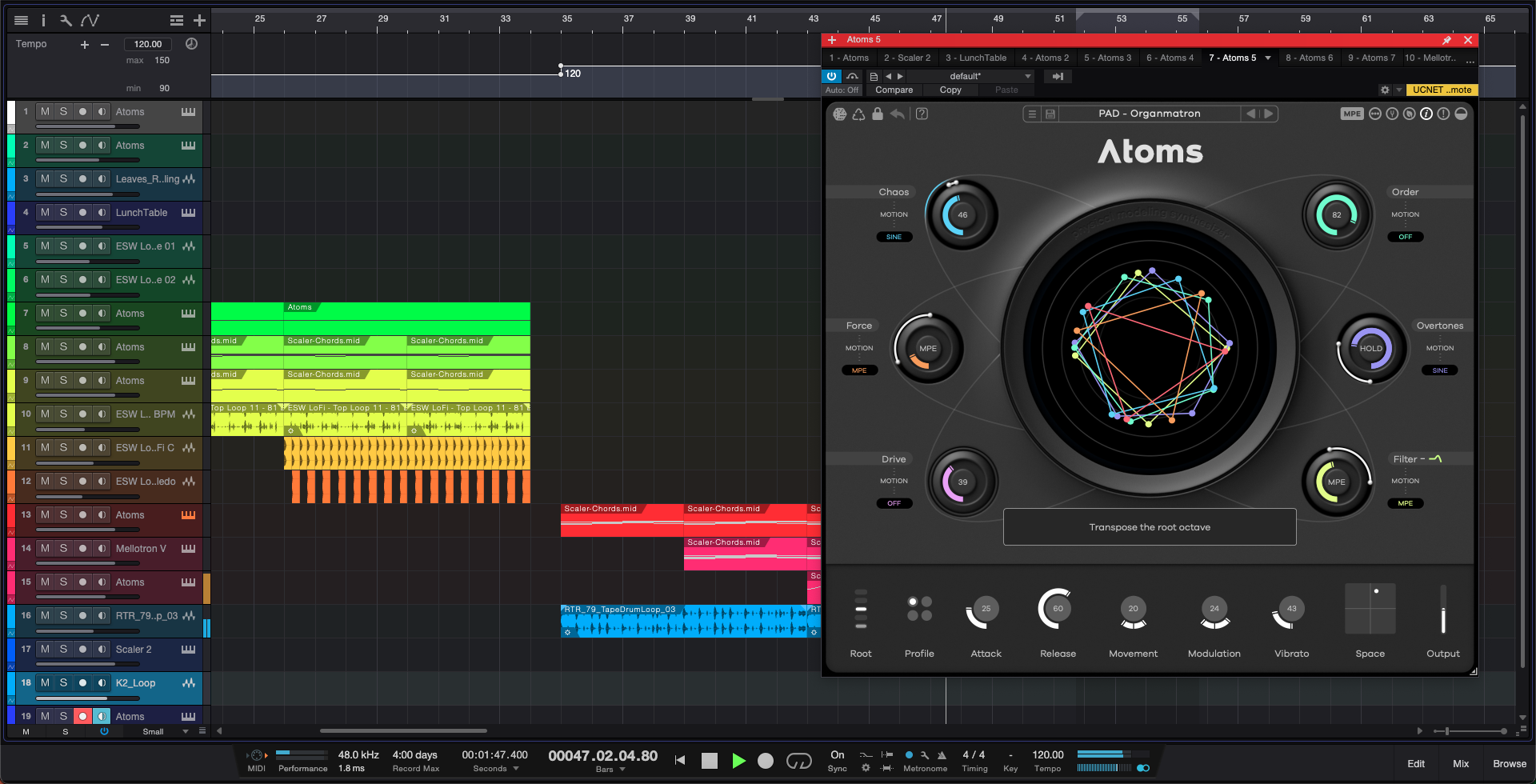 특이한 컨셉을 가지고 있는 Baby Audio의 Atoms를 간단하게 사용해보았다. 필자가 데모를 작업하고 있을 때, 신세를 지고 있는 작곡가분이 보더니 굉장히 앰비언트 뮤직에 어울릴 것 같다는 의견을 남겨주었다. 그리고 실제로 그 쪽에 많이 특화되어 있다. 스프링을 현으로 비벼서 소리를 내는 현악기의 구조를 피지컬 모델링한 결과물은 꽤 괜찮다고 느껴졌다. 구현하기 어려운 현악기의 특성상 자연스럽지 않은 부분들이 몇 있었지만 고유한 맛이 있어서 오히려 마음에 드는 부분들도 많았다. 내장되어 이펙터들은 꽤 독특한 느낌을 많이 만들어낼 만한 여지들이 많이 있다. 가장 마음에 들었던 이펙터는 Chaos인데, 피치를 떨어뜨리는 게 묘한 느낌을 줘서 자주 걸어 쓸 듯 하다. 다만 피치가 떨어지는 느낌이 때에 따라 좋지 않기에 타이밍을 잘 맞춰써야할 듯 하다. 처음 Atoms를 사용할 때 스트링 및 패드 계열의 프리셋이 많아서 무척 CPU 자원을 많이 사용하지 않을까 걱정했다. 그런데 사용에 무리를 줄 정도로 많이 사용하지 않아 좀 놀랐다. 피지컬 모델링의 장점이 아닐까 싶다.