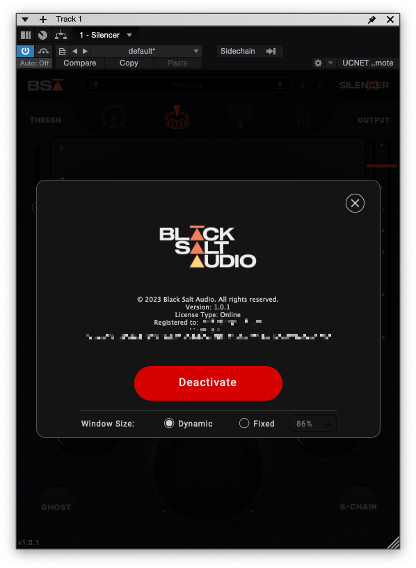 Black Salt Audio Silencer에는 특별한 설정이라 부를 만한 기능들이 없다. 이미 설정할 수 있는 기능들은 전부 밖에 나와 있다. 좌측 상단의 Black Salt Audio 로고를 누르면 라이센스 등록 정보와 컴퓨터 ID, 인증 해제 버튼 등이 자리 잡고 있다. 이 페이지에서 설정할 수 있는 기능이 딱 하나 있는데, 바로 창 크기다. 창 크기를 Dynamic 모드로 사용하면 유동적으로 크기를 자유롭게 조절할 수 있으며, Fixed로 하면 미리 설정한 비율대로 창 확대/축소가 일어나게 된다. 가장 무난한 설정값은 Dynamic 모드이므로 필자는 Dynamic 모드로 설정했다.