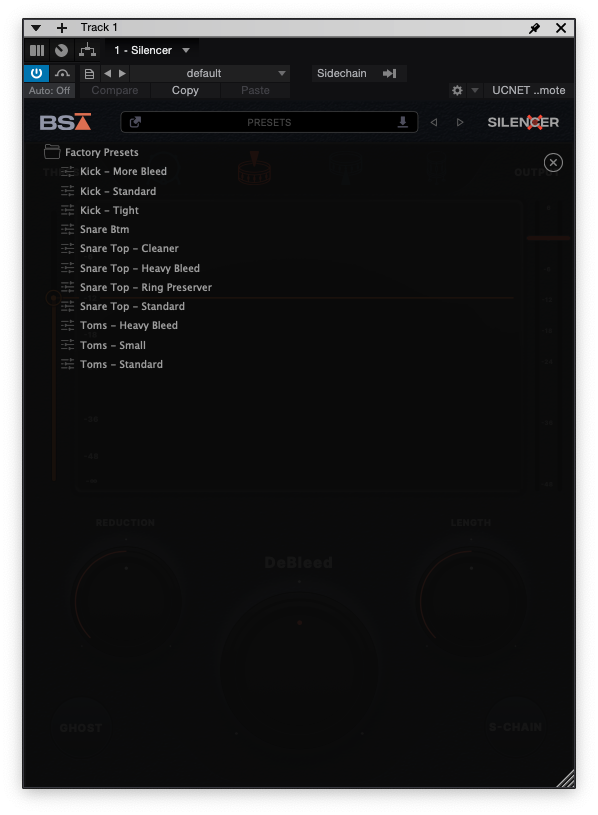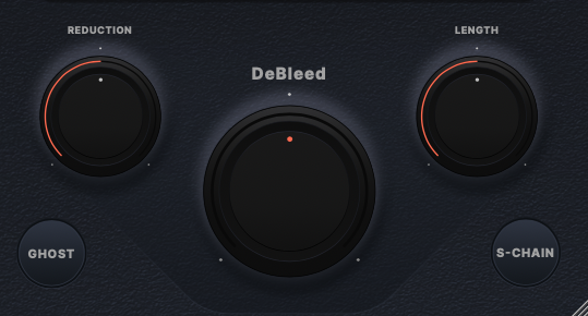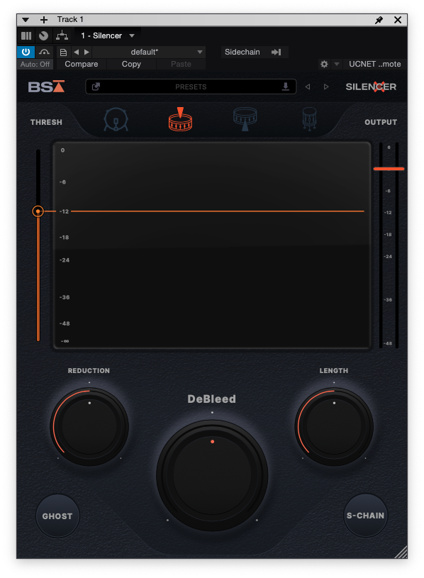 하단에는 게이트를 조작하기 위한 노브들이 있는데 직관적인 이름과 디자인 덕분에 조작하는데 문제가 없다. 노브들은 Reduction, DeBleed, Length가 전부다. 그 밑에는 Ghost 버튼과 S-Chain 버튼이 자리 잡고 있다. 노브 쪽에 커서를 갖다 대면 정확한 세부 값들을 보여주는 배려가 꽤 마음에 들었다. 리덕션 노브는 게이트에 통과되지 못한 소스들을 어느 정도로 감소할지를 결정하는 노브다. 처음 불러왔을 때의 기본값은 -40dB다. 소스를 들어보면서 완전히 차단하게 할 것인지, 아니면 약간 풀어줄 것인지를 결정할 수 있다. DeBleed 노브는 하이햇 등의 높은 주파수의 악기를 Black Salt Audio만의 특별한 알고리즘을 통해 획기적으로 소리 크기를 줄여주는 노브다. Silencer의 핵심 노브기도 하다. Length는 드럼의 서스테인에 맞춰 Reduction의 길이를 결정하는 노브다. 서스테인이 짧은 소스라면 Length 값을 짧게 주면 되고, 서스테인이 긴 소스라면 역시 Length 값을 길게 주면 된다. 초기값은 1000ms다.