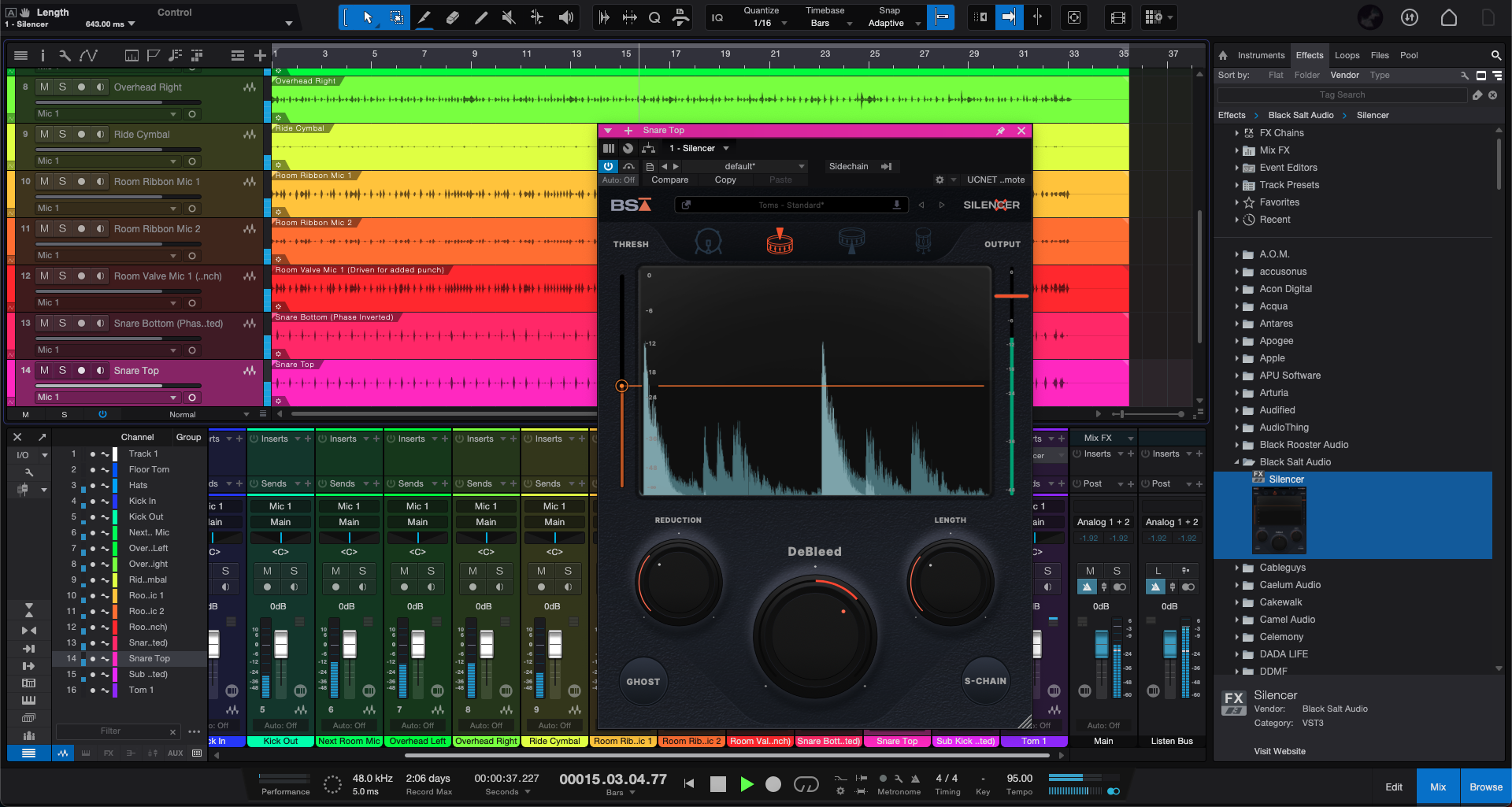 백문이불여일견이라고, Black Salt Audio Silencer가 제대로 작동하는지 실제로 사용해 보자. 아쉽게도 필자가 최근에 리얼 드럼 레코딩을 진행한 적이 없기에 부득이하지만 Bleed가 일어나는 드럼 스템을 가져왔다. 이 스템은 어느 정도 처리가 된 스템이기에 Bleed가 그렇게 심각하지는 않지만 톰과 스네어 일부에서 Bleed가 일어나고 있다. 이를 Black Salt Audio Silencer로 어떻게 제어할 수 있는지 한번 영상으로 알아보도록 하자.