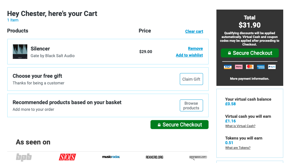 홈페이지 상단 우측에 자리 잡은 Cart를 누르면 다음과 같은 화면이 나타난다. 이 화면에서는 이번 구매로 적립되는 캐시, 구매로 적립되는 토큰을 확인할 수 있으며 상품 구매로 받을 수 있는 무료 선물을 선택할 수 있다. 만일 Plugin Boutique에서 처음 구매한다면 Claim Gift를 클릭해서 무료 선물을 받아가는 게 좋다. 플러그인 하나만 샀을 뿐인데 공짜로 다른 플러그인들도 가져갈 수 있다. 무료로 받을 수 있는 플러그인들은 기간에 따라 다르니 미리 구매 전에 어떤 걸 무료로 주는지 체크해 보는 것도 좋다. 모든 작업이 완료되었다면 초록색 "Secure Checkout"을 눌러 다음 화면으로 넘어가자.