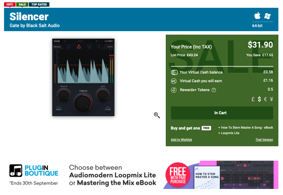 Black Salt Audio Silencer 구매 링크 (PluginBoutique)를 클릭하거나, Plugin Boutique(링크)에 접속한 후, 검색창에 "Black Salt Audio Silencer"를 검색하면 위와 같은 화면이 나타난다. Plugin Boutique는 회원 가입을 하지 않아도 상품 구매가 가능하지만, 회원 가입을 하는 편이 추후 라이센스 관리에 용이하다. 기본값은 파운드화로 나타나지만 달러나 엔, 유로화로 가격을 바꿔가며 확인할 수 있다. 다만, 대한민국 원은 지원하지 않으므로 해외 결제가 지원되는 카드나 페이팔 계정을 미리 준비할 필요가 있다. Add to Cart를 클릭하여 상품을 내 장바구니로 담자.