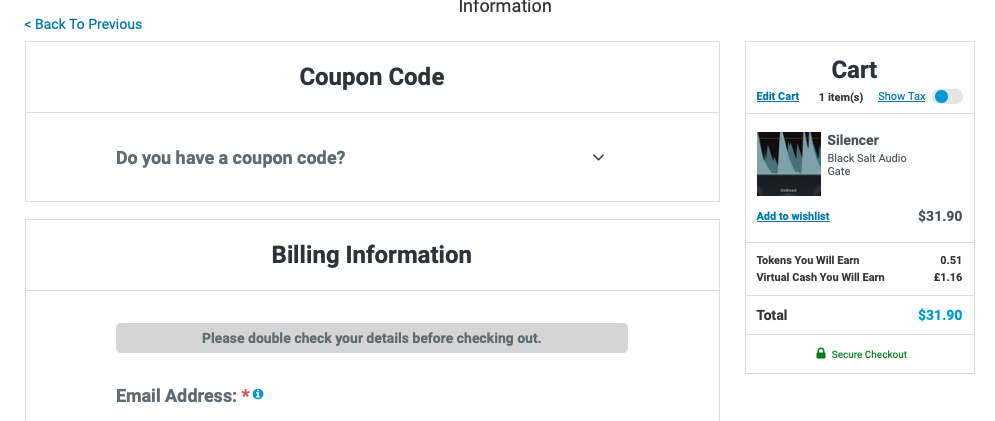 Plugin Boutique을 이용한다면 정확히 반대의 경우가 된다. 플러그인 개발사 사이에 Plugin Boutique라는 징검다리가 생겨 곧바로 라이센스를 받지 못하는 경우도 있다. 또한 Plugin Boutique 또한 이윤을 추구하기 때문에 평균적으로 공식 홈페이지보다 가격 자체는 살짝 비싼 감이 있다. 그러나 더욱 다양한 구매 옵션 및 할인 행사나 번들 증정 행사를 꾸준히 진행하고 있어 세금을 포함해 결제하더라도 체감 비용이 공식 홈페이지에서 구매했을 때보다 더 낮은 경우도 빈번하다. 그렇기에 필자는 해외에서 플러그인을 구매할 때 대부분 Plugin Boutique를 이용한다. 요즘 들어서 Plugin Boutique에서는 아무 플러그인이나 구매하더라도 사은품으로 다른 플러그인을 주거나, 믹싱 및 마스터링 관련 E-Book을 끼워주는 이벤트를 자주 하고 있다. 만일 Plugin Boutique를 사용하지 않았던 분이라면 이 참에 사용해 보는 것도 좋다. 그런고로 아래의 접은 글에서는 Plugin Boutique를 통해 Black Salt Audio Silencer를 구입하는 방법에 대해 알아보도록 하겠다.
