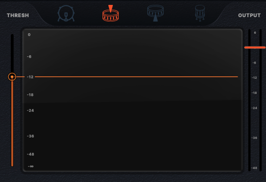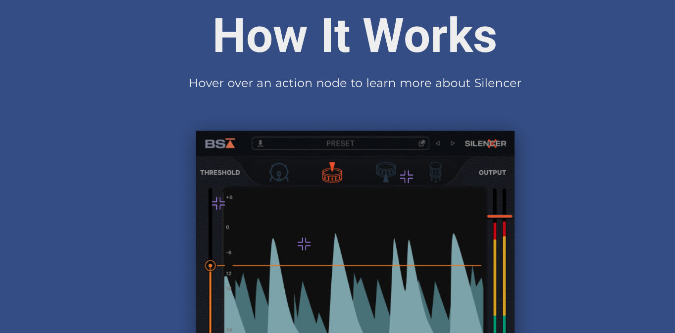 Silencer의 조작부에 대해서 간단하게 살펴보는 시간이다. Silencer는 크게 2가지로 나눠서 설명할 수 있다. 상단부와 하단부. 무슨 곤충 같은 설명법이냐고 뭐라 할 수도 있지만 진짜로 상단부와 하단부로 나누는 게 빠르다. 각설하고, 상단부에는 스레숄드 설정과 아웃풋 설정, 그리고 Silencer 모드 설정이 있다. 스레숄드 및 아웃풋이야 다른 다이나믹 계열 이펙터들에서 흔히 볼 수 있는 기능들이니 넘어가고, 상단의 Silencer 모드 설정이 핵심이다. Silencer 모드란 Silencer가 어떤 소스를 기준으로 작동할지를 미리 정한다고 보면 된다. 소스의 종류는 킥, 스네어 상단, 스네어 하단, 톰 계열로 나뉜다. 지금 Silencer가 어떤 소스에 걸려 있는지에 맞춰 모드를 골라주면 세팅 끝이다. 예를 들어 스네어 상단과 하단에 마이킹을 해서 드럼 레코딩을 했는데, 스네어 쪽에만 유난히 하이햇 및 심벌의 에너지가 세게 들어왔다면 Silencer 모드의 스네어를 골라주면 된다.