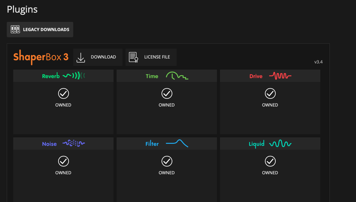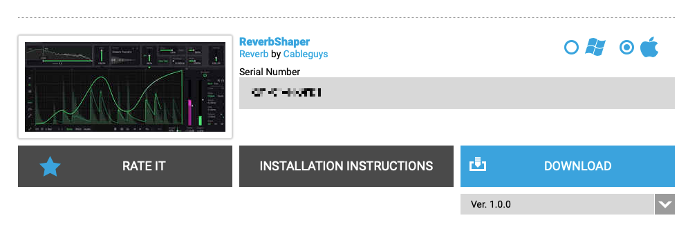 이제 플러그인 설치 및 라이센스 파일을 받아놓자. Cableguys 홈페이지에서 바로 전에 입력한 이메일과 비밀번호로 로그인을 하면 가지고 있는 플러그인 리스트들이 표시된다. 스크롤을 조금 하다 보면 오늘의 주인공, ReverbShaper이 모습을 드러낸다. 상단에 보이는 Download와 License File 버튼을 클릭해 프로그램 및 라이센스 파일을 미리 받아놓자. 만일 Download와 License File 버튼이 표시되지 않고 가격이 표시된다면 제대로 등록이 되지 않았다는 뜻이다. 제조사에 문의하거나 다시 등록을 진행해 보자.