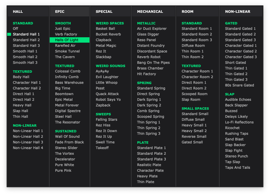 그런데 의외로 지원하는 리버브 패턴이 굉장히 많다. 순수한 공간을 구현할 목적의 리버브도 있겠지만 사운드 디자인을 위한 독특한 패턴들도 있기에 믹싱에서도, 사운드 디자인용로도 사용할 수 있는 리버브다.