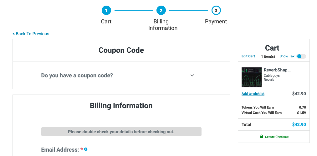 ReverbShaper 구매 링크 (PluginBoutique)를 클릭하거나, Plugin Boutique(링크)에 접속한 후, 검색창에 "ReverbShaper"를 검색하면 위와 같은 화면이 나타난다. Plugin Boutique는 회원 가입을 하지 않아도 상품 구매가 가능하지만, 회원 가입을 하는 편이 추후 라이센스 관리에 용이하다. 기본값은 파운드화로 나타나지만 달러나 엔, 유로화로 가격을 바꿔가며 확인할 수 있다. 다만, 대한민국 원은 지원하지 않으므로 해외 결제가 지원되는 카드나 페이팔 계정을 미리 준비할 필요가 있다. Add to Cart를 클릭하여 상품을 내 장바구니로 담자.
