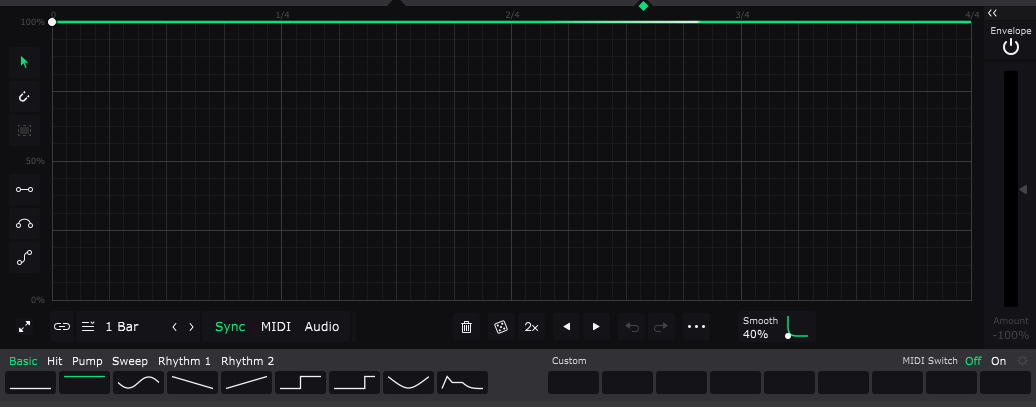 LFO 그래프 옆에는 작은 기능이 하나 숨어있는데, 바로 Envelope 기능이다. 일종의 트리거라면 보면 되는데 평소에는 작동하지 않다가 특정 레벨 이상이 감지되면 리버브가 작동하는 형태로 작동한다. 컴프레서를 생각한다면 거의 비슷하다. 다만 스레숄드를 넘게 되면 리덕션이 일어나는 컴프레서와 달리 리버브가 작동할 뿐이다.
