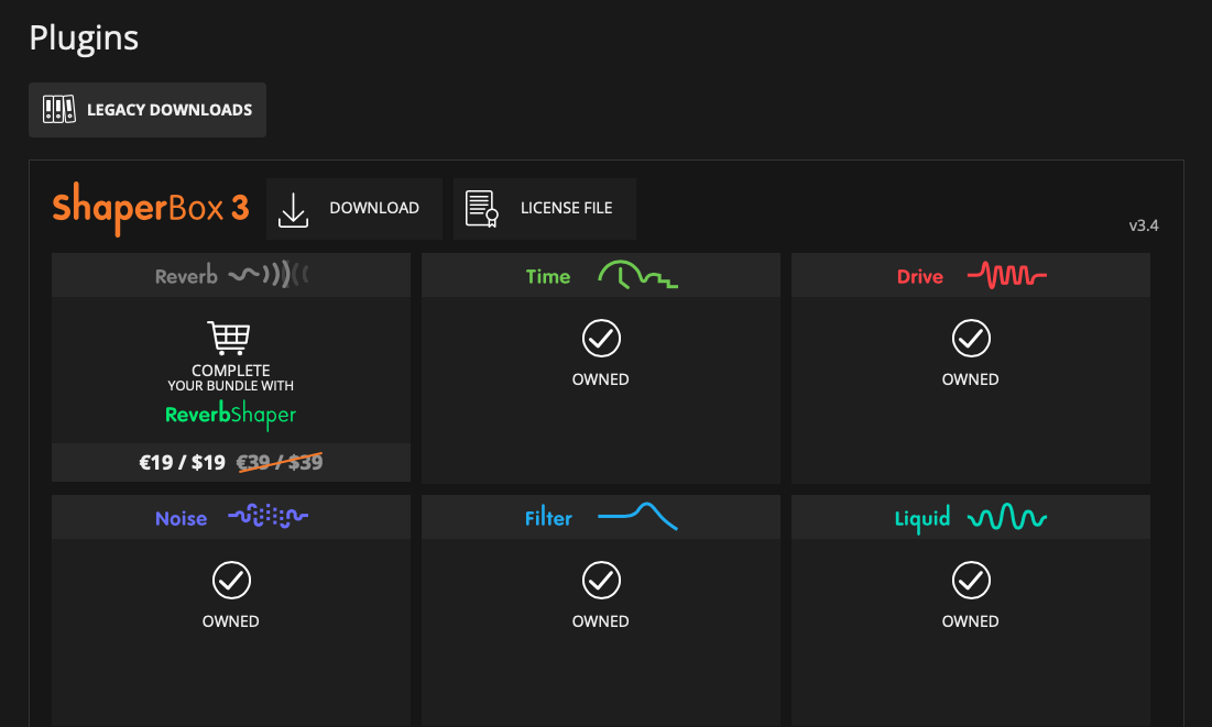 이제 플러그인 설치 및 라이센스 파일을 받아놓자. Cableguys 홈페이지에서 바로 전에 입력한 이메일과 비밀번호로 로그인을 하면 가지고 있는 플러그인 리스트들이 표시된다. 스크롤을 조금 하다 보면 오늘의 주인공, ReverbShaper이 모습을 드러낸다. 상단에 보이는 Download와 License File 버튼을 클릭해 프로그램 및 라이센스 파일을 미리 받아놓자. 만일 Download와 License File 버튼이 표시되지 않고 가격이 표시된다면 제대로 등록이 되지 않았다는 뜻이다. 제조사에 문의하거나 다시 등록을 진행해 보자.