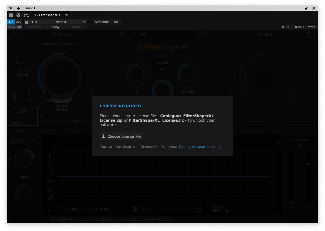 다음은 라이센스를 집어넣는 과정이다. ReverbShaper를 DAW 상에서 실행하면 "라이센스가 필요합니다"라는 메시지가 나타난다. 방금 전에 받아놓은 라이센스 파일을 "Choose License File"을 눌러 플러그인에 집어넣어 주자. 사진은 FilterShaper XL이지만 등록 과정은 동일하다. 라이센스 파일의 이름은 "Shaperbox3_License.lic"다.