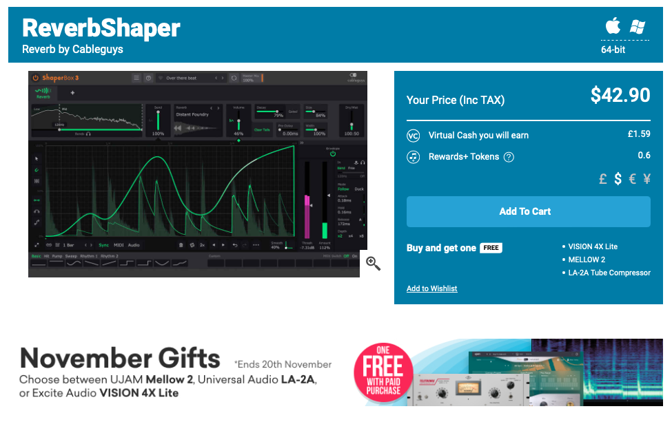 ReverbShaper 구매 링크 (PluginBoutique)를 클릭하거나, Plugin Boutique(링크)에 접속한 후, 검색창에 "ReverbShaper"를 검색하면 위와 같은 화면이 나타난다. Plugin Boutique는 회원 가입을 하지 않아도 상품 구매가 가능하지만, 회원 가입을 하는 편이 추후 라이센스 관리에 용이하다. 기본값은 파운드화로 나타나지만 달러나 엔, 유로화로 가격을 바꿔가며 확인할 수 있다. 다만, 대한민국 원은 지원하지 않으므로 해외 결제가 지원되는 카드나 페이팔 계정을 미리 준비할 필요가 있다. Add to Cart를 클릭하여 상품을 내 장바구니로 담자.